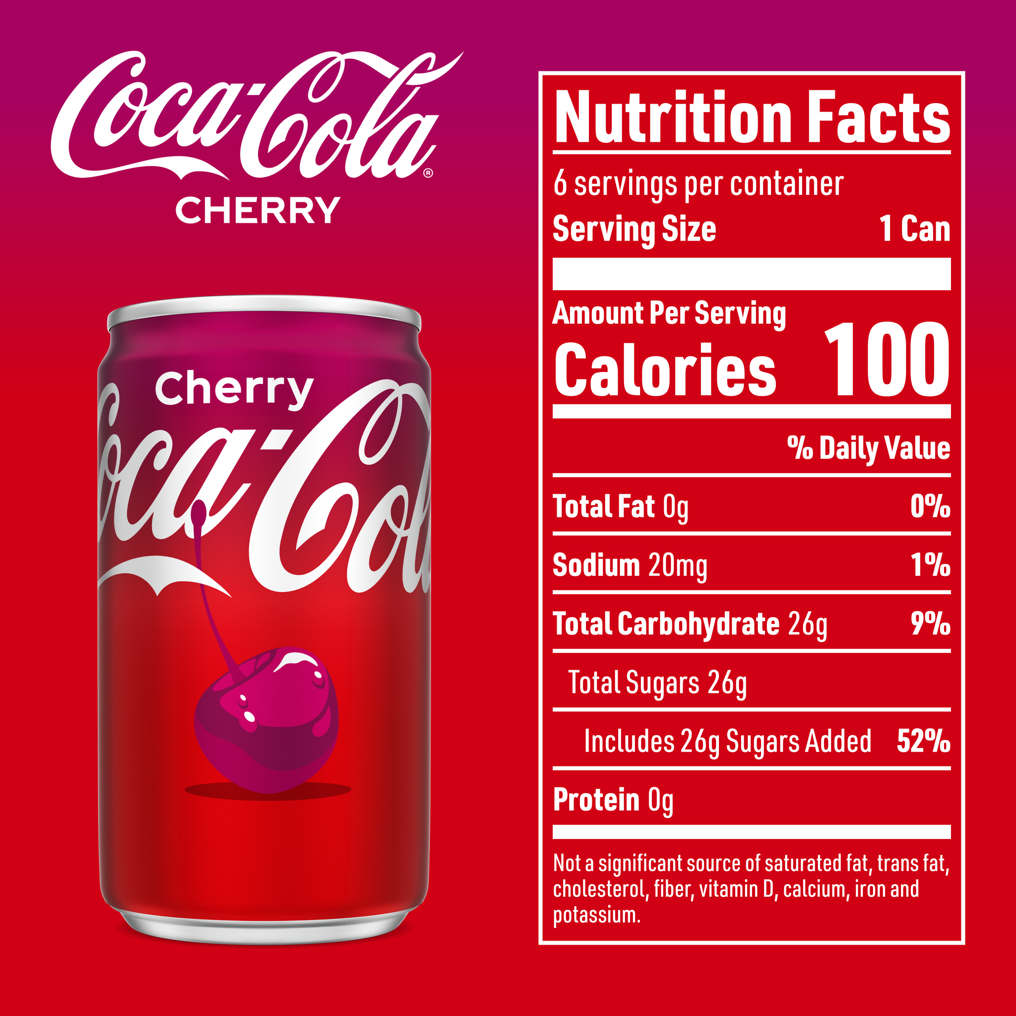 Soda. Pop. Soft drink. Sparkling beverage. Whatever you call it, nothing compares to the refreshing, crisp taste of Coca-Cola Cherry. A little flavor can make a lot of magic happen and Coca-Cola Cherry is here to make your taste buds happy. Enjoy with friends, on the go or with a meal. Whatever the occasion, Coca-Cola Cherry makes life’s special moments a little bit better. Every sip, every “ahhh,” every smile—find that feeling with Coca-Cola Cherry. Best enjoyed ice-cold for maximum refreshment. Grab a Coca-Cola Cherry and find your “ahhh” moment. Enjoy Coca-Cola Cherry.